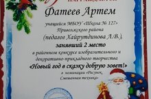 Поздравляем Фатеева Артема с Грамотой за 2 место в райном конкусе "Новыйгод в сказку добрую зовет", руководитель Хайрутдинова Л.В.
