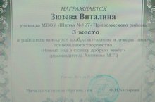 Поздравляем Зюзеву Виталину с Грамотой за 3 место в райном конкусе "Новыйгод в сказку добрую зовет", руководитель Аминова М.Г..
