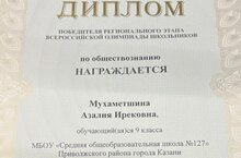 Поздравляем ученицу 9 класса Мухаметшину Азалию с Диплом победителя регионального этара олимпиады по обществознанию.