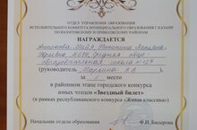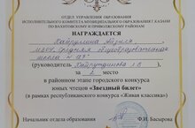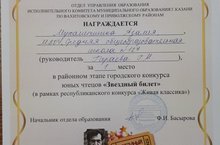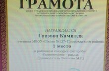 Поздравляем Гаязову Камилу с Грамотой за 1 место в райном конкусе "Удивительное рядом", руководитель Аминова М.Г.