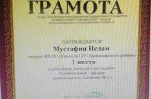 Поздравляем Мустафина Ислама с Грамотой за 1 место в райном конкусе "Удивительное рядом", руководитель Аминова М.Г.