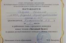Поздравляем Гаязову Камилу с Грамотой за 1 место в райном этапе городского конкуса юных чтецов "Звездный билет", руководитель Ферафонтова А.И.