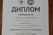 Поздравляем Хайрутдинова Азамат, ученика 6 класса, с победой в онлайн-олимпиаде Winkid по русскому языку.