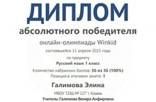 Поздравляем Галимову Элину, ученицу 1 класса, с победой в онлайн-олимпиаде Winkid по русскому языку(абсолютный победитель). Руководитель: Галимова В.А.