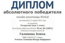 Поздравляем Галимову Элину, ученицу 1 класса, с победой в онлайн-олимпиаде Winkid по татарскому языку(абсолютный победитель). Руководитель: Галимова В.А.