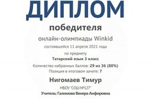 Поздравляем Нигомаева Тимура, ученика 3 класса, с победой в онлайн-олимпиаде Winkid по татарскому языку.