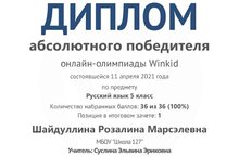 Поздравляем Шайдуллину Розалину, ученицу 5 класса, с победой в онлайн-олимпиаде Winkid по русскому языку(абсолютный победитель).Руководитель: Суслина Э.А.