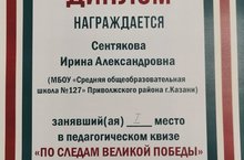 Поздравляем Сентякова И.А., занявшую 1 место в педагогическом квизе "По следам Великов Победы"