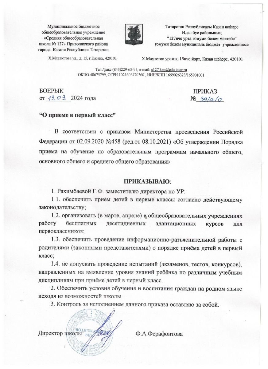 Приказ МБОУ "Школа№127" № 39/а/о от 13.03.2024 "О приеме в 1 класс"