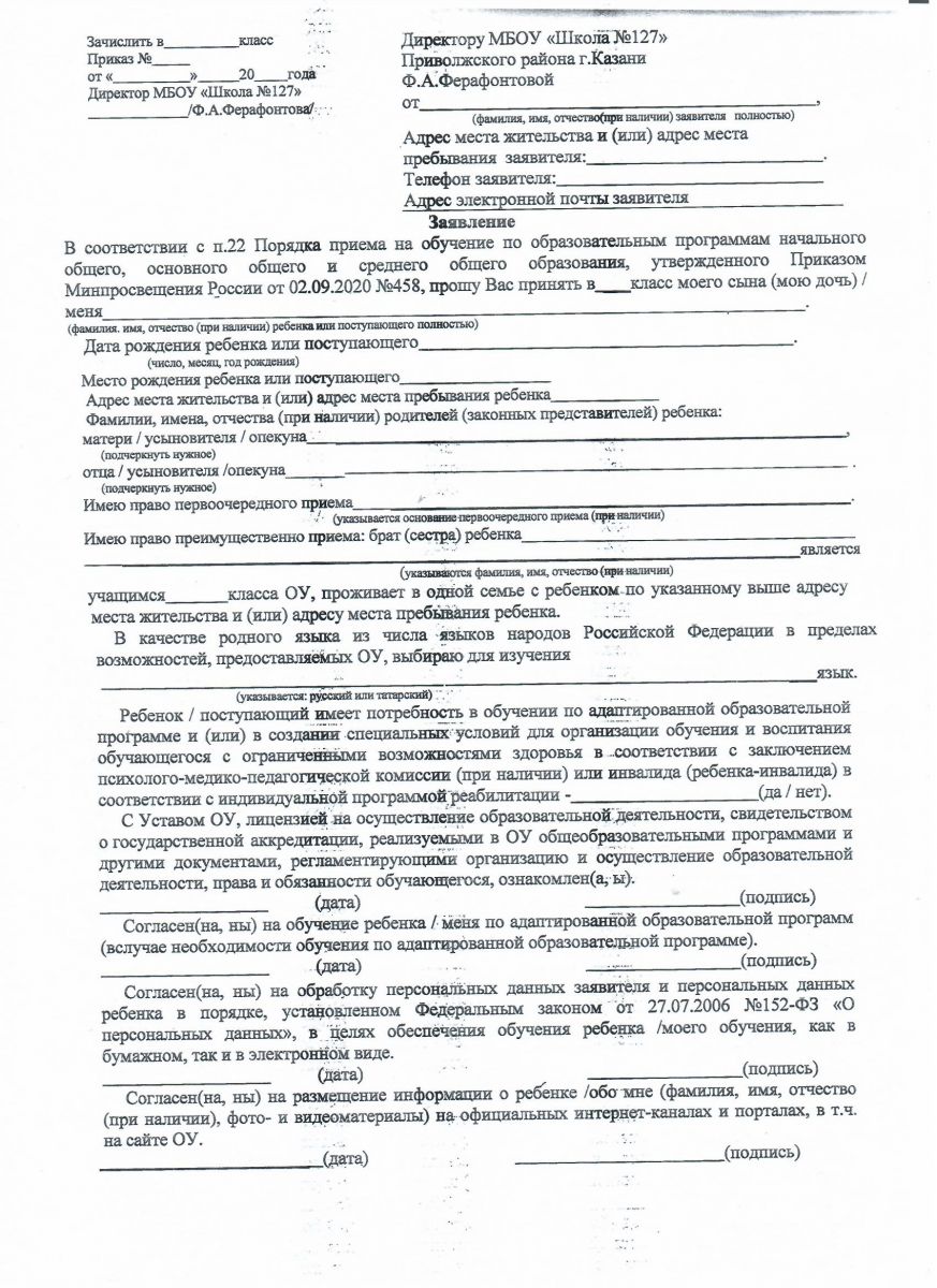 Приказ МБОУ "Школа №127" о приеме в 1 класс