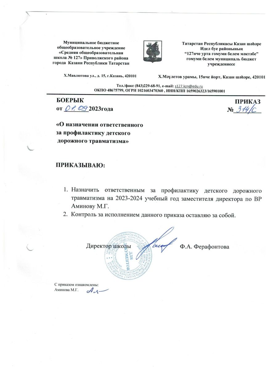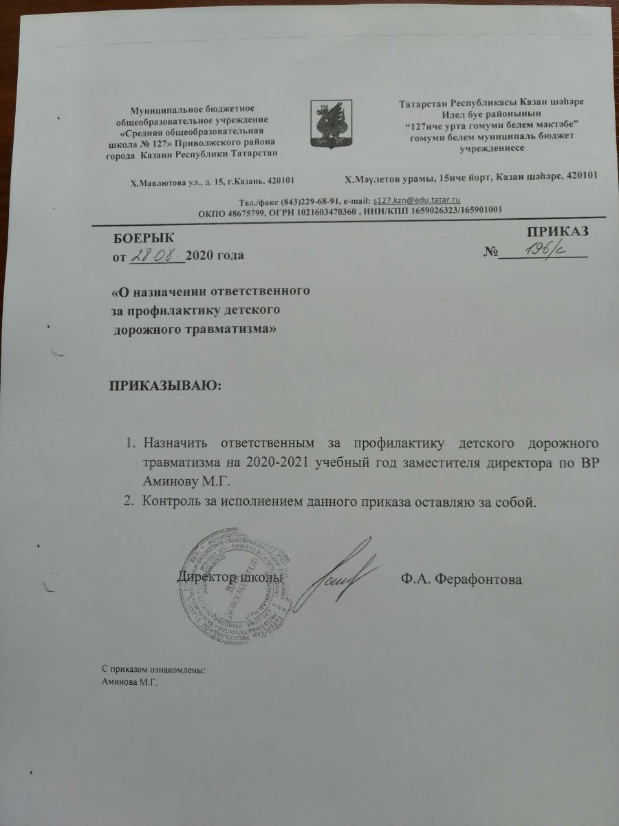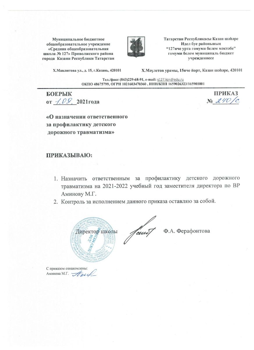 Приказ о назначении ответственного по профилактике ДТП 2021г