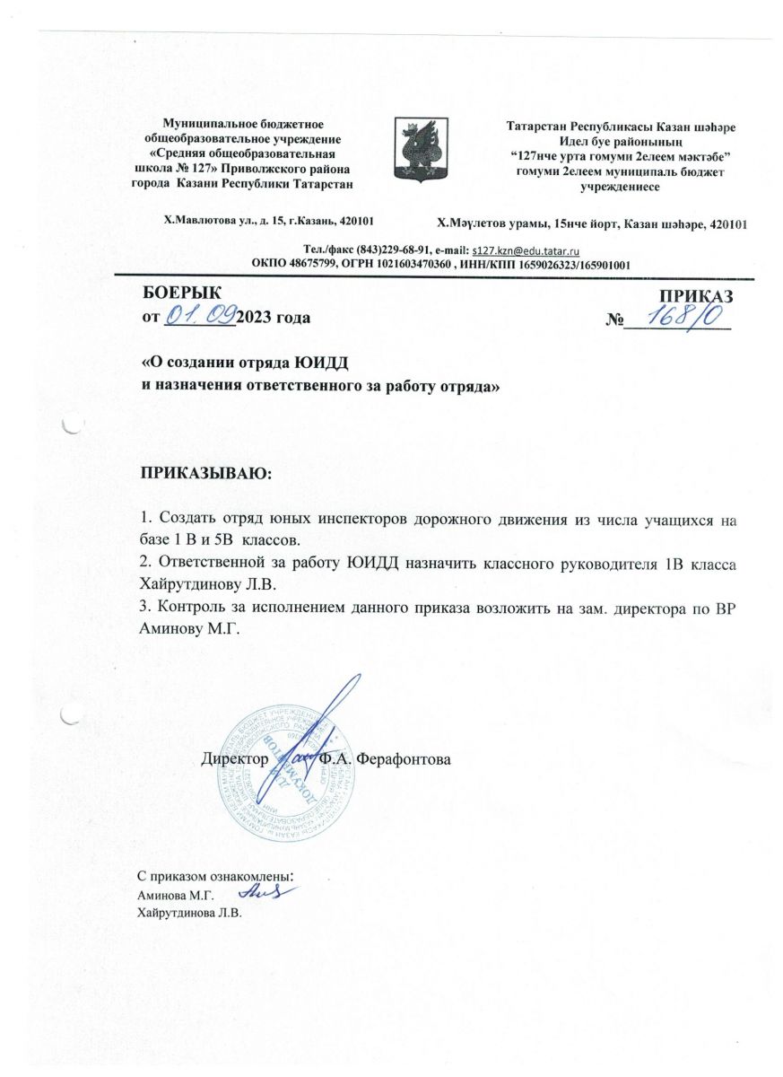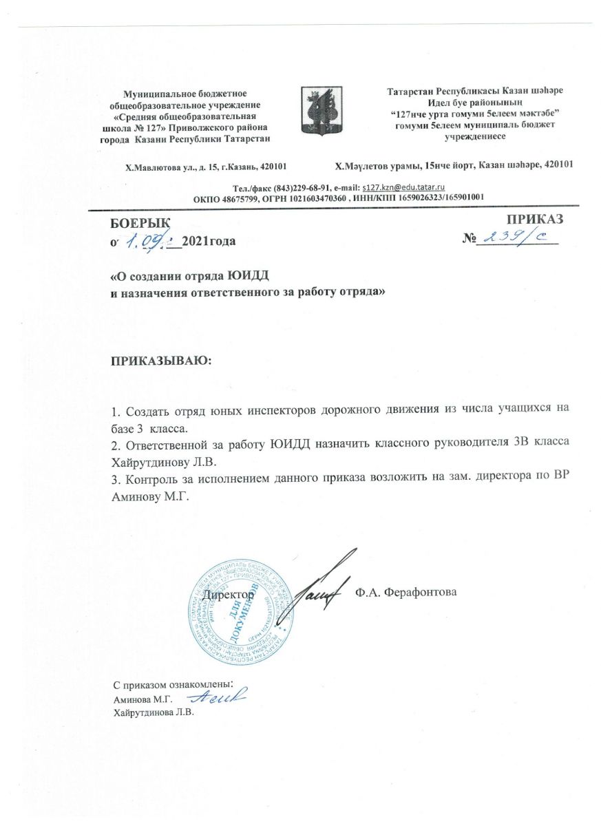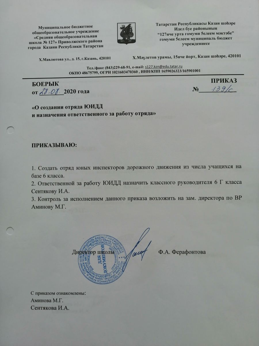 Приказ о создании отряда ЮИДД и назначении ответственного