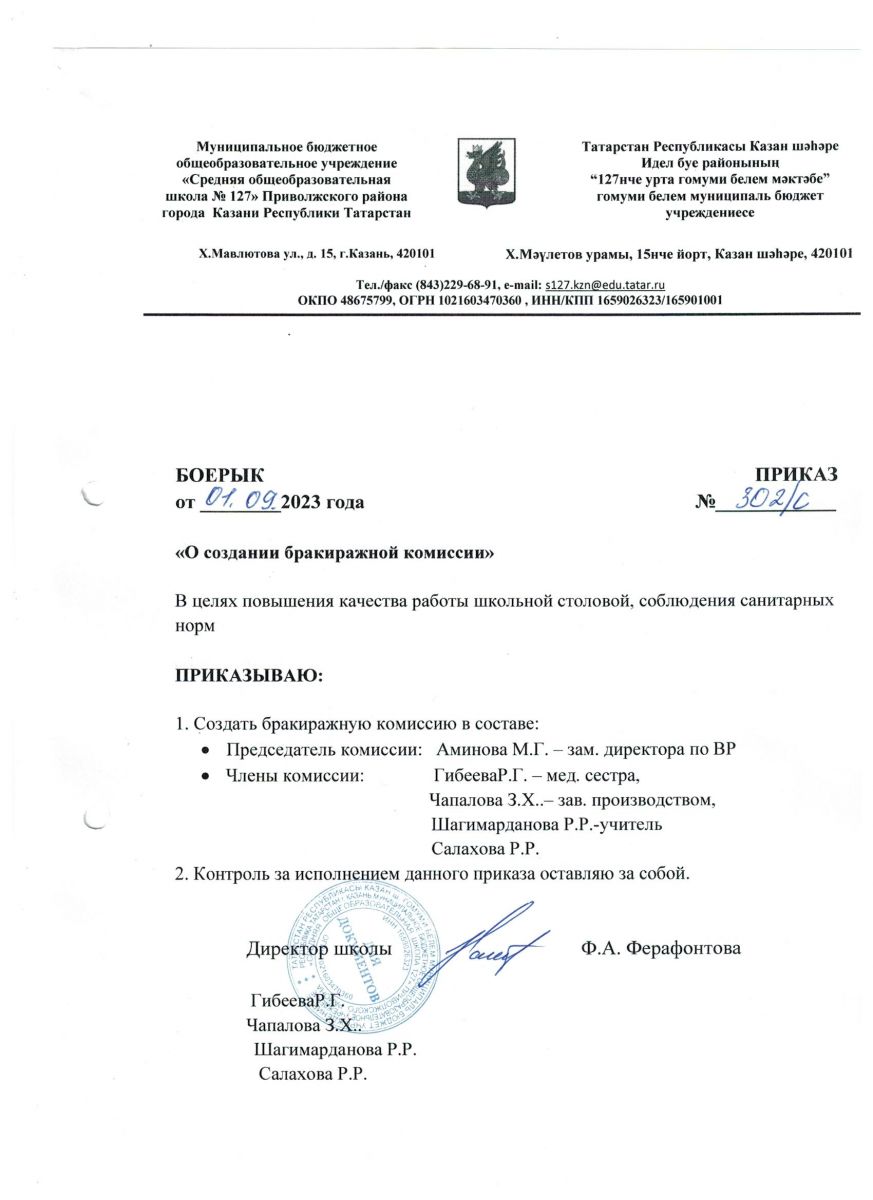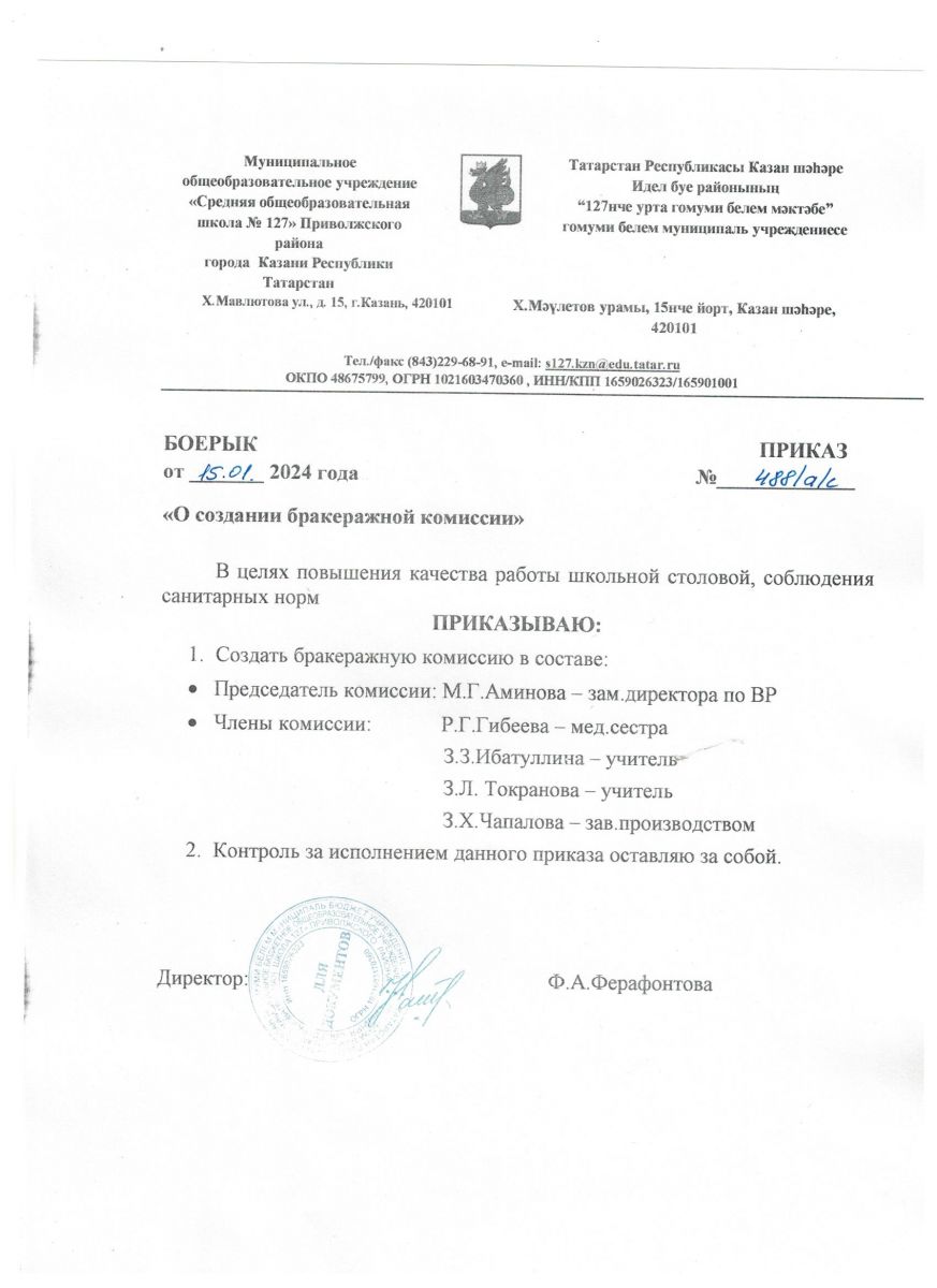 Приказ о создании бракеражной комиссии с 9.01.2024