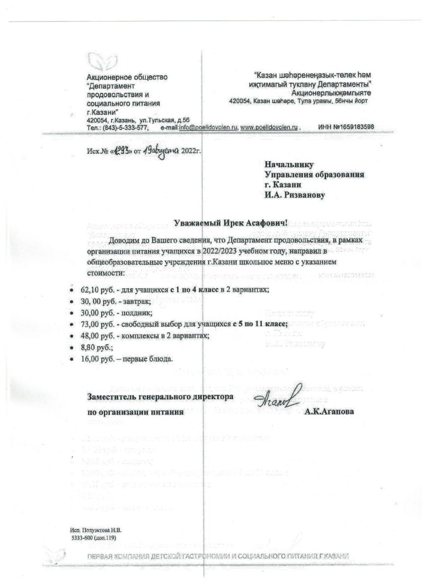 Утвержденное Департаментом продольствия и социального питания г.Казани