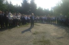 Все ученики школы запустили в небо прикрепленных к воздушным шарам голубей , на которых были напсаны имена погибших участнико ВОВ или тружеников тыла.