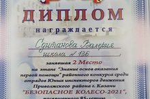 Поздравляем Сдитанову Валерию занявшую 2 место на этапе « Знание основ оказания первой медицинской помощи» районного конкурса среди отрядов ЮИД Приволжского района г. Казани "Безопасное колесо- 2021”, посвящённое 85- летию Госавтоинспекции МВД России.
