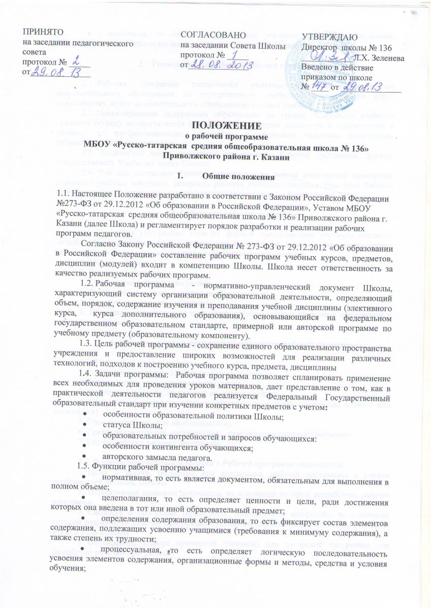 ПОЛОЖЕНИЕ о рабочей программе МБОУ «Русско-татарская средняя общеобразовательная школа № 136» Приволжского района г. Казани