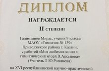 Поздравляем Галимьянова Мираса, учащегося 9а класса (учитель Романова Л.Ю.), получившего диплом 2 степени на XVI республиканской научно-практической конференции школьников им.Л.Н.Толстого.