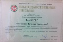 6 июня 2015г. на торжественной церемонии закрытия Международной Олимпиады по русскому языку для школ с родным (нерусским) языком обучения, проходившей на базе Поволжской государственной академии спорта и туризма, куда были приглашены победители и призеры общеобразовательных учреждений РТ и других субъектов РФ и СНГ, директору гимназии Т.С.Борер было вручено Благодарственное письмо Министерства образования и науки РТ за весомый вклад в развитие русского языка и повышения качества его образования. Поздравляем Татьяну Сергеевну с заслуженной наградой и желаем дальнейших творческих успехов!