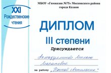 30 января 2023 года на базе гимназии 75 прошел очный этап научно- практической конференции «Рождественские чтения». Минсабирова Амина, ученица 4А класса, заняла третье место в математической секции с работой «Многогранность числа 13» (руководитель Макарова М. Н.).