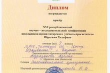 Гимназисты приняли участие в республиканской научно-исследовательской конференции имени татарского учёного Ибрагима Хальфина. Основной целью конференции является создание условий для учащихся, которые стремятся пополнять, совершенствовать свои знания в области разных наук, развивать свой интеллектуальный потенциал. Абдразакова Аделия, ученица 9 класса, продемонстрировала результаты своего самостоятельного поиска и стала призером данной конференции (учитель Лукманова Н.В.)
