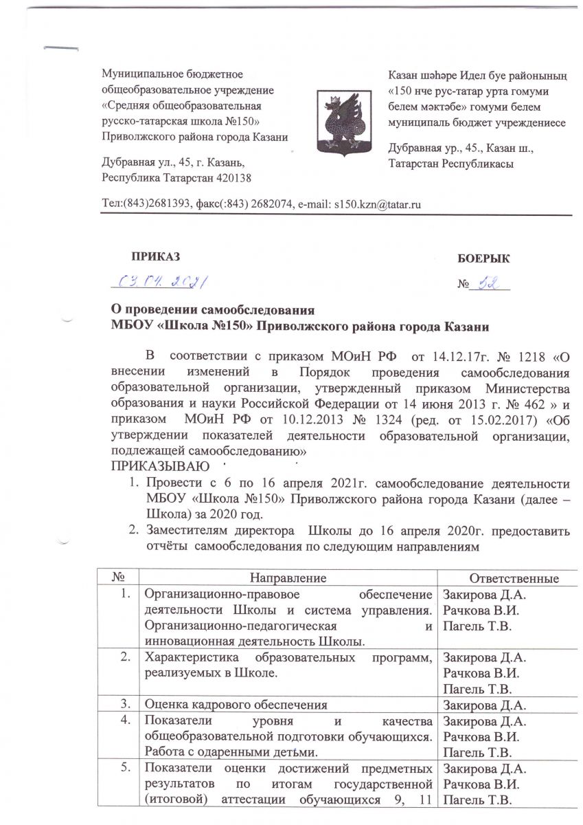 Приказ об утверждении отчета о самообследовании МБОУ "Школа №150" 2020-2021 учебный год