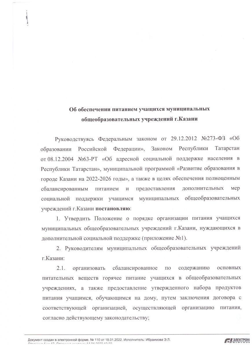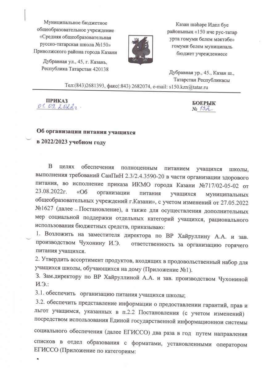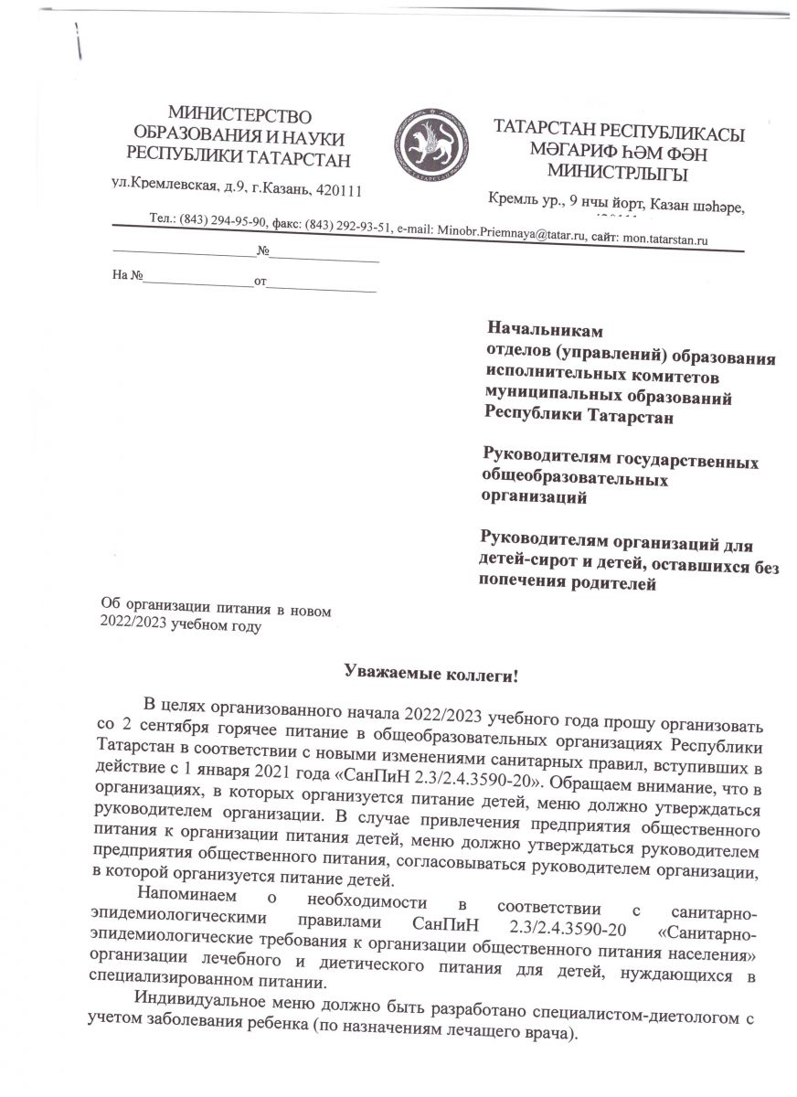 Приказ МО и Н РТ ""Об организации питания учащихся в новом 2022-2023 учебном году"