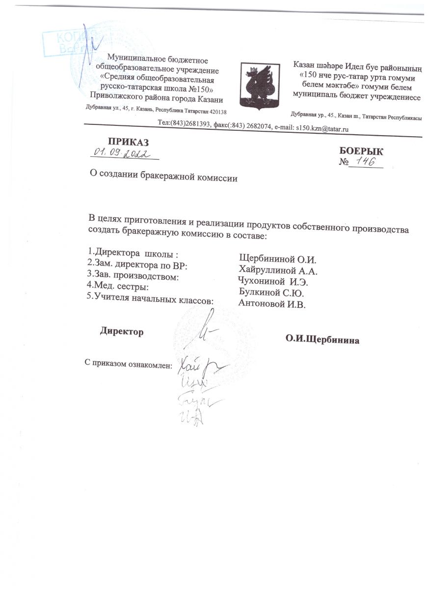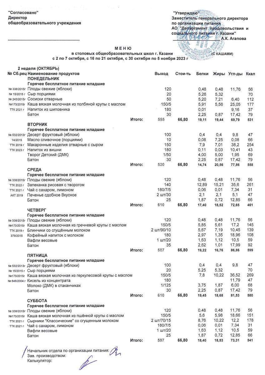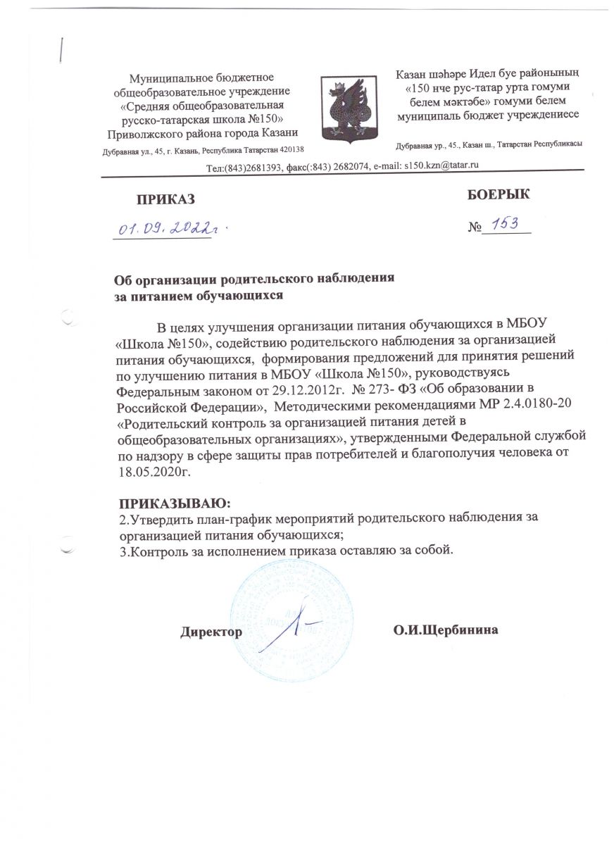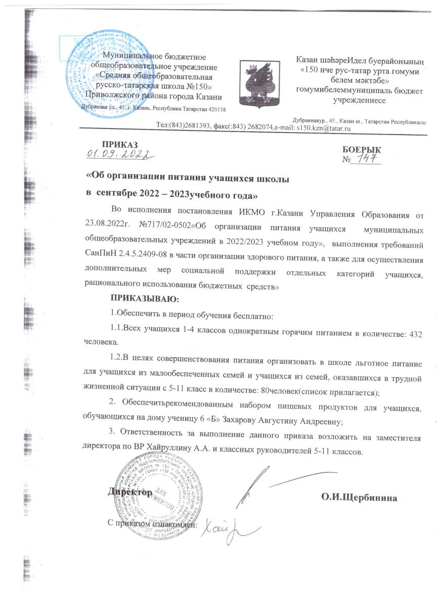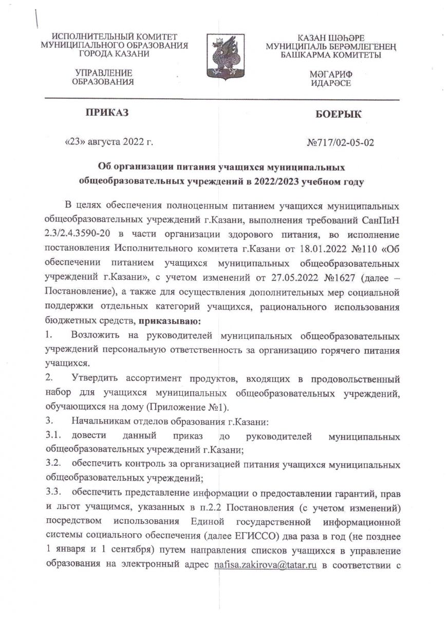 Приказ по организации питания ИКМО г.Казани Управления образования в 2023-2024 учебном году