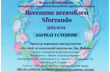 26 марта Оркестр народных инструментов под руководством Павлова Александра Ивановича приняли участие в Всероссийском конкурсе камерных и вокальных ансамблей, оркестров и хоров "Весенние ассамблеи Sforzando". Концертмейстеры: Айдимирова А.А., Терехина С.А., Каримова Г.К., Альтафова А.Р., Егорова С.Г. Солисты: Ханиева Диляра Ильгизаровна, Буслаева Арина.