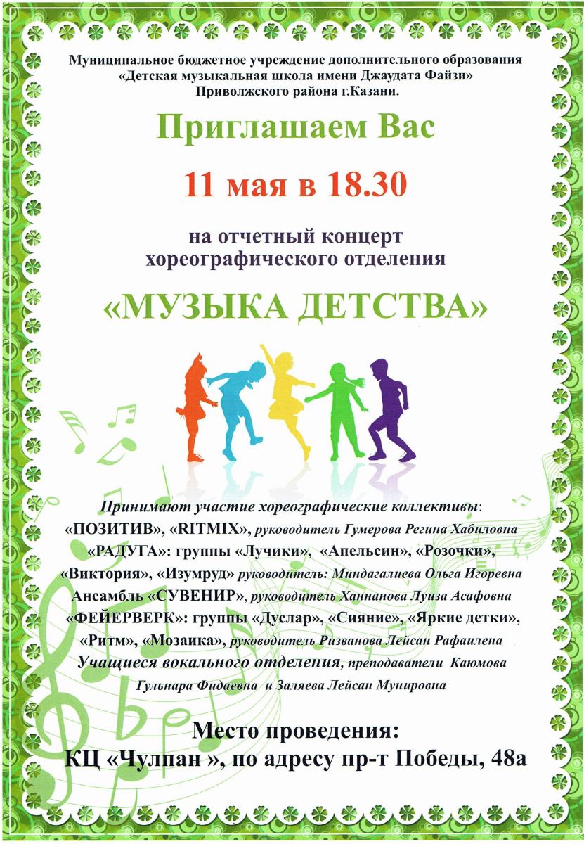 24 мая в 18.30 - отчётный КОНЦЕРТ хореографического отделения "Музыка детства" (КЦ "Чулпан", по адресу: пр-т Победы, 48а). Руководители: Ризванова Л.Р., Миндагалиева О.И., Гумерова Р.Х. Афиша -