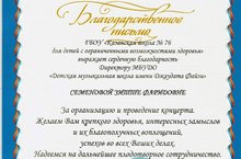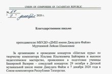 10 декабря - организация и проведение благотворительного концерта преподавателями музыкальной школы: Айдимировой А.А., Ахметовой А.Р., Каюмовой Г.Ф., Моисеевой Е.А., Мухаметзяновой Д.Р., Павлова А.И., Терехиной С.А., Ханнановой Л.А., Шиверова С.М. для детей с ограниченными возможностями здоровья на базе ГБОУ "Казанская школа № 76". БЛАГОДАРСТВЕННОЕ ПИСЬМО.