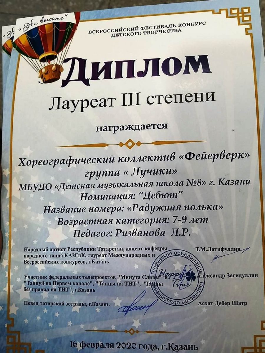 16 февраля - Всероссийский фестиваль-конкурс детского творчества "На высоте" - выступление хореографического коллектива "Фейерверк" - группа "Лучики" - Лауреат III степени. Руководитель: Ризванова Л.Р. ПОЗДРАВЛЯЕМ! Диплом