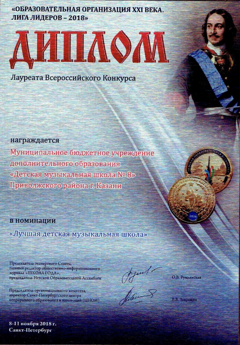 МБУДО "ДМШ № 8" - Лауреат Всероссийского конкурса "Образовательная организация XXI века. Лига лидеров - 2018" в номинации: "Лучшая детская музыкальная школа". Диплом ; Удостоверение - эффективный руководитель: Карманова Гульфия Галиевна)