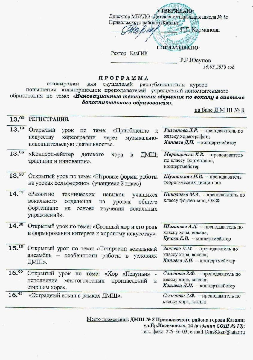 16 марта - стажировка для слушателей республиканских курсов повышения квалификации преподавателей учреждений дополнительного образования по теме: «Инновационные технологии обучения по вокалу в системе дополнительного образования». (на базе ДМШ № 8) Программа семинара. https://edu.tatar.ru/priv/page2399.htm/page3597880.htm# (см.фото)