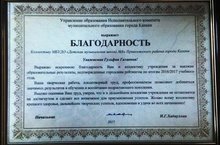 Благодарность УО ИК МО г.Казани директору Кармановой Г.Г. и коллективу МБУДО "ДМШ № 8" по итогам городского рейтинга 2016-17 учебного года.