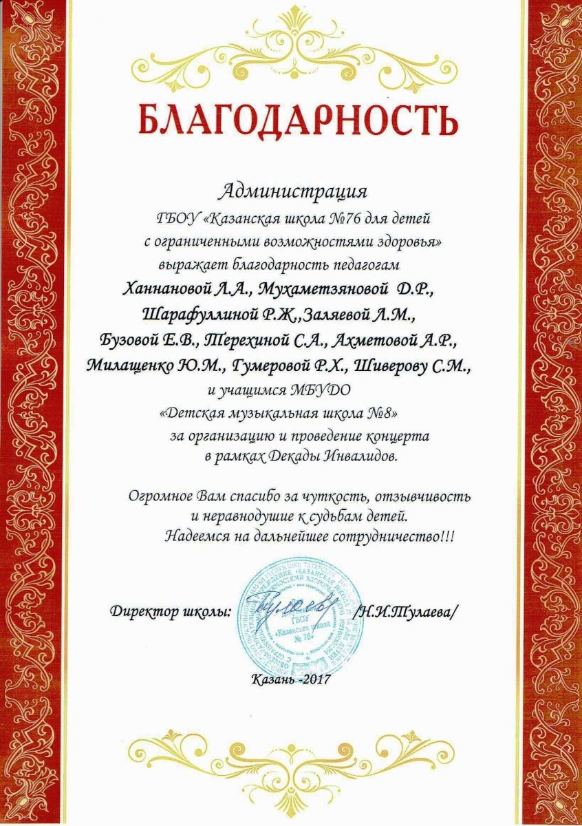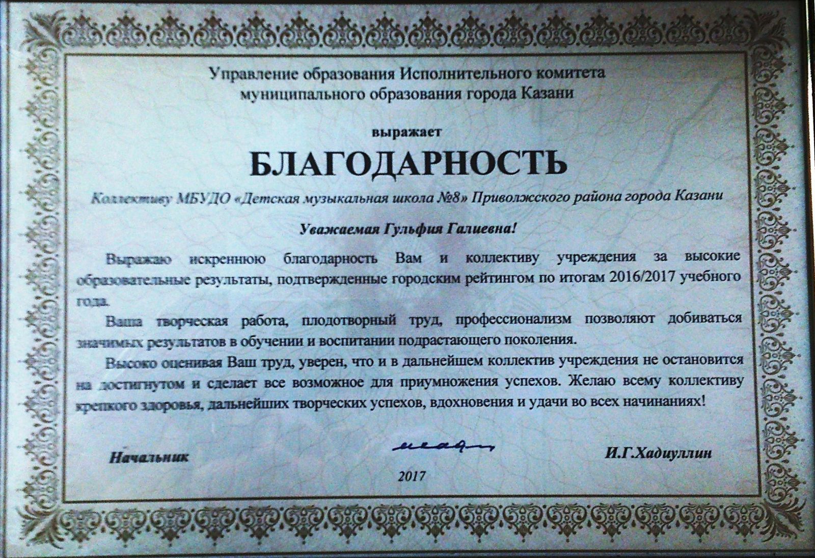 - Благодарность УО ИК МО г.Казани по итогам городского рейтинга, 2017 г.