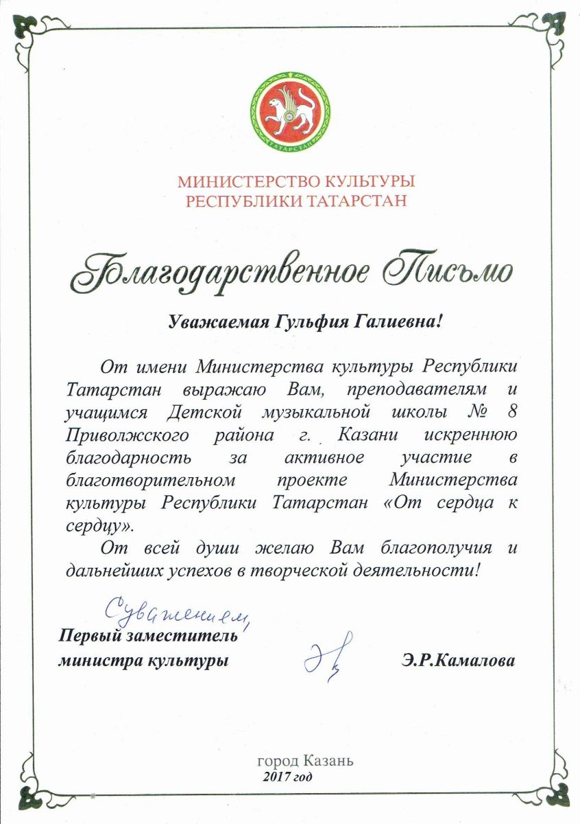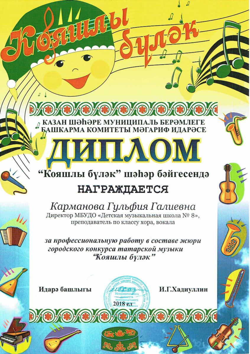 Гала-концерт Лауреатов городской конкурс татарской музыки «Кояшлы бүләк». (Куратор - руководитель ГМО татарских отделений ДМШ и ДШИ - Каюмова Г.Ф., преподаватель ДМШ № 8, Приказ УО г.Казани № 658 от 31.08.2017 г. "О назначении городских кураторов") |