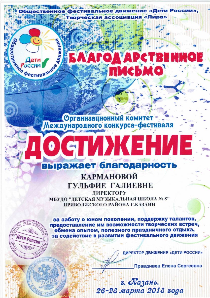 Международный конкурс – фестиваль детского и юношеского творчества «Достижение». При поддержке Общественного фестивального движения «Дети России» Фонда поддержки и развития детского и юношеского творчества «Лира». (Программа, Благодарственное письмо) |