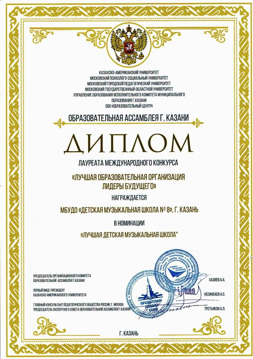 - Лауреат конкурса "100 лучших организаций дополнительного образования детей России" в номинации "Лучшая детская музыкальная школа - 2017" - ДИПЛОМ (г.Санкт-Петербург)