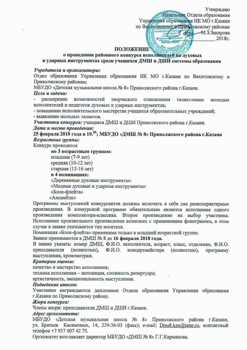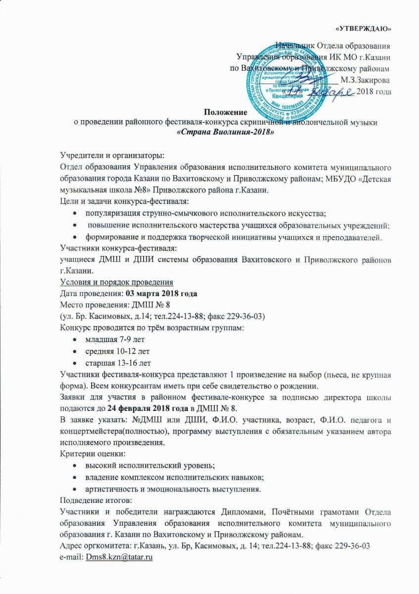 Районный конкурс испонителей на духовых и ударных инструментах среди учащихся ДМШ и ДШИ системы образования (Приказ, Положение) Районный фестиваль-конкурс скрипичной и виолончельной музыки «Страна Виолиния-2018» (Приказ, Положение) |