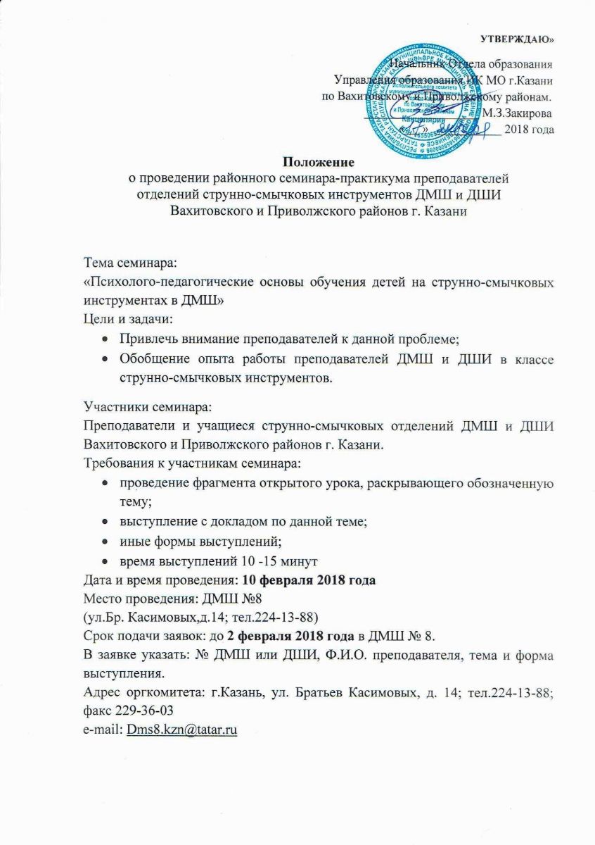 Районный семинар-практикум преподавателей отделений струнно-смычковых инструментов ДМШ и ДШИ Вахитовского и Приволжского районов г. Казани (Положение) |