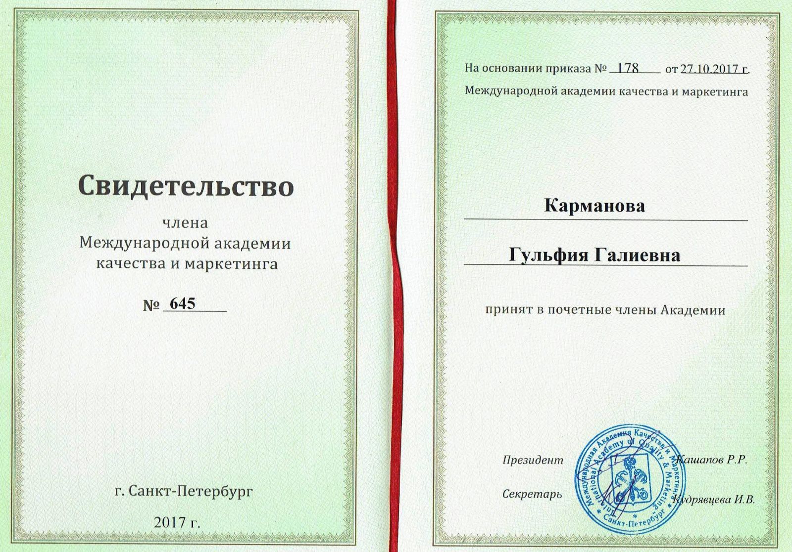 - Почётный член международной академии качества и маркетинка - СВИДЕТЕЛЬСТВО