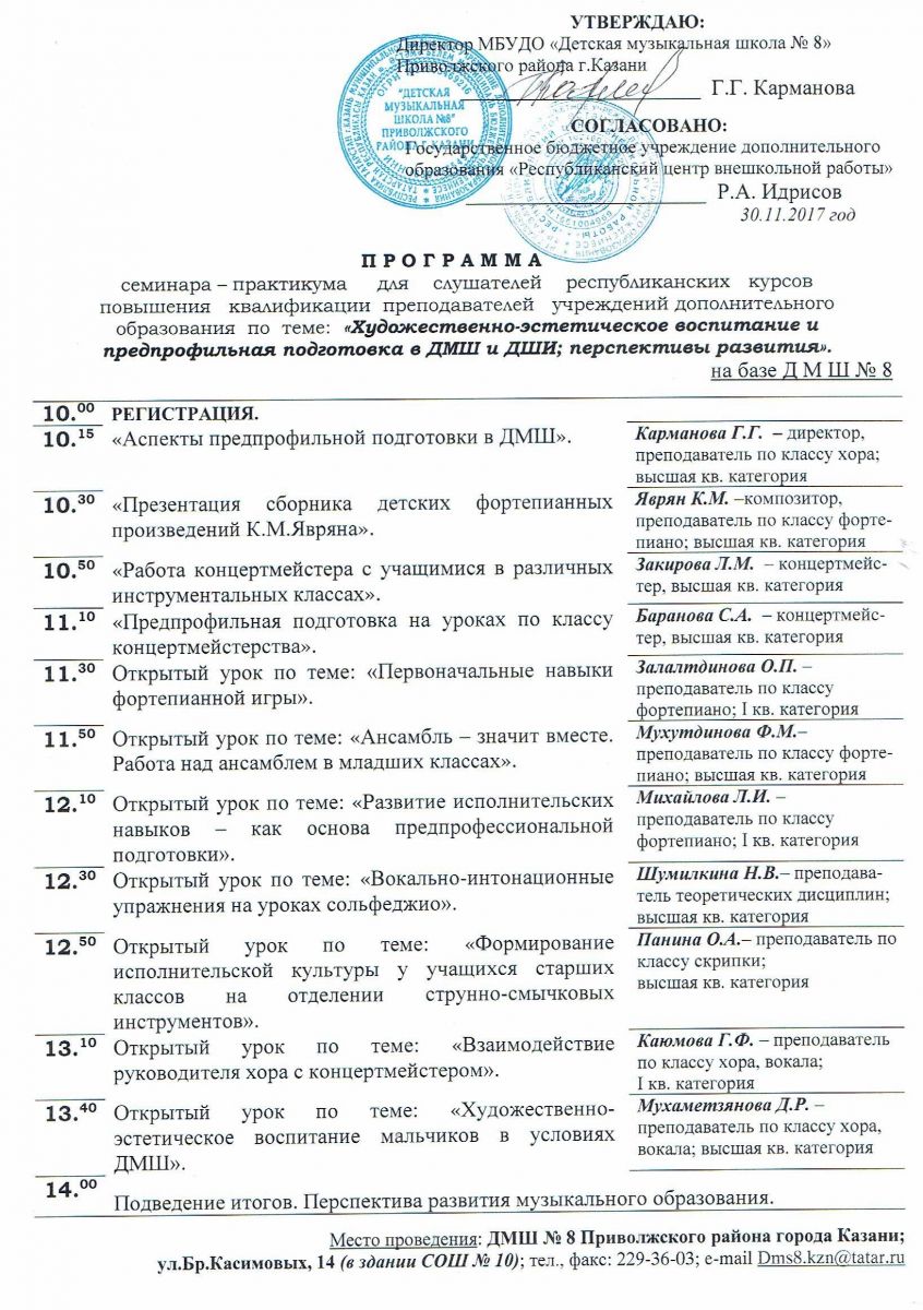 Стажировка для слушателей республиканских курсов повышения квалификации преподавателей учреждений дополнительного образования по теме: «Инновационные технологии обучения по вокалу в системе дополнительного образования». (Приказ МОиН РТ №под - 2136/17 от 29.12.2017г., программа) |