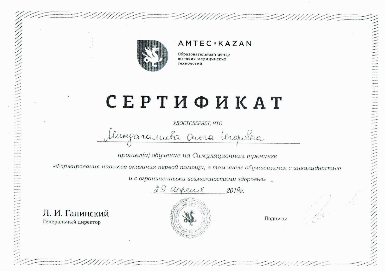 Сертификат образовательного центра высоких медицинских технологий (Миндагалиева О.И.)