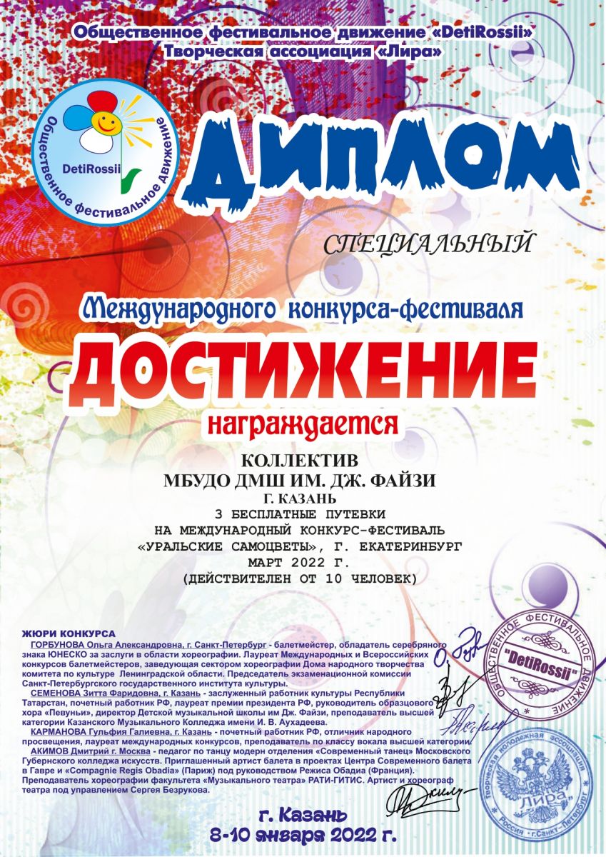 - Специальный диплом международного конкурса-фестиваля "Достижение" на коллектив - 3 бесплатные путевки на международный конкурс-фестиваль "Город мастеров" г. Екатеринбург осень 2023 г.