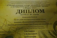 Камалыева Камиля Диплом Лауреата 3 степени (преподаватель Глазунова Г.Б., концертмейстер Веселова Н.Н.)