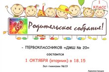 1 октября (вторник) в 18.15 состоится Родительское Собрание Первоклассников "ДМШ № 20". Зал Гимназии № 19