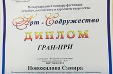 Поздравляем Новожилову Самиру, преп. Ромашова Т.Ю. - ГРАН-ПРИ Международного конкурса-фестиваля детского, юношеского творчества "Арт-содружество" в номинации "Инструментальный жанр"