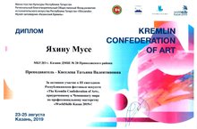 Поздравляем Яхина Мусу, преп. Киселёва Т.В. - Дипломант III Ежегодного Республиканского Фестиваля искусств "The Kremlin Confederation of Art", приуроченному к Чемпионату Мира по профессиональному мастерству "WorldSkills Kazan 2019"