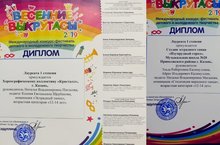 IV Всероссийский конкурс творческих дарований "Весны прекрасное творение" - Ансамбль "Млада" , преп. Самойлова А.В., конц. Гилязов И.В. - Лауреат II степени; Ансамбль "Озорные звездочки" - Лауреат II степени, преп. Байбикова В.Н., Самолйова А.В., конц. Гилязов И.В.; Ансамбль Сородинский Арсений, Буров Вячеслав - Лауреат III степени в номинации "Инструментальное исполнительство", Ансамбль Ахмадишин Ильдар, Хайруллин Карим, Чудинова Агата - Лауреат III степени, Ансамбль Валиуллова Камила, Чудинова Агата - Лауреат III степени, преп. Фраучи Д.В.